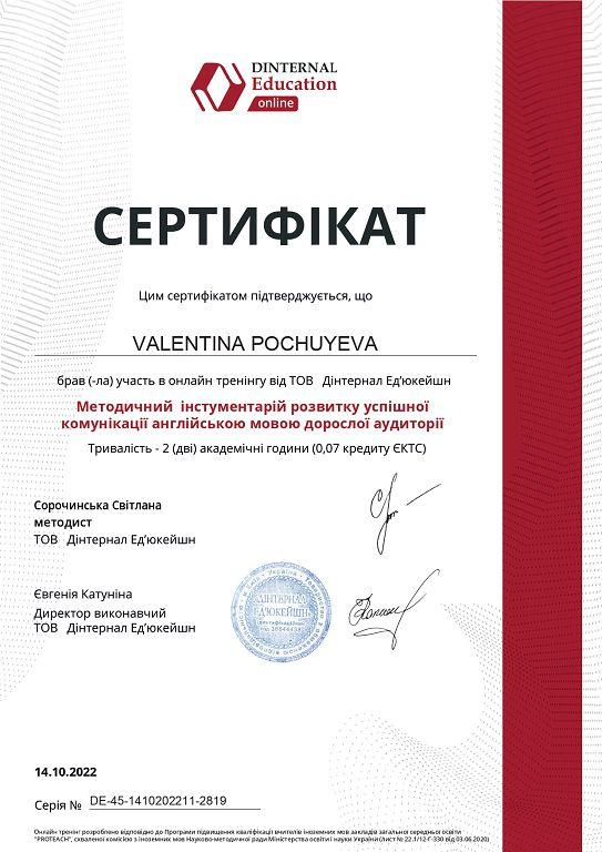За результатами тренінгів Валентина Почуєва отримала навички визначати основні критерії при виборі автентичного ресурсу для підготовки студентів до іспитів з англійської мови, максимально якісно використовувати увесь потенціал автентичного ресурсу з вивчення англійської мови, планувати індивідуальні траєкторії навчання у різних групах студентів і залучати їх в англомовне середовище за допомогою сучасних комунікативних вправ.