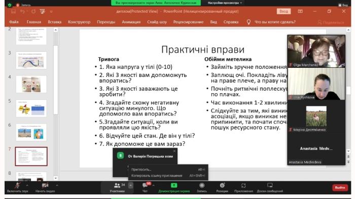 Для студентів-психологів факультету № 6 Харківського національного університету внутрішніх справ у межах проходження педагогічної практики було проведено бінарне заняття за темою «Як подолати страхи та тривогу та адаптуватись до нових умов».