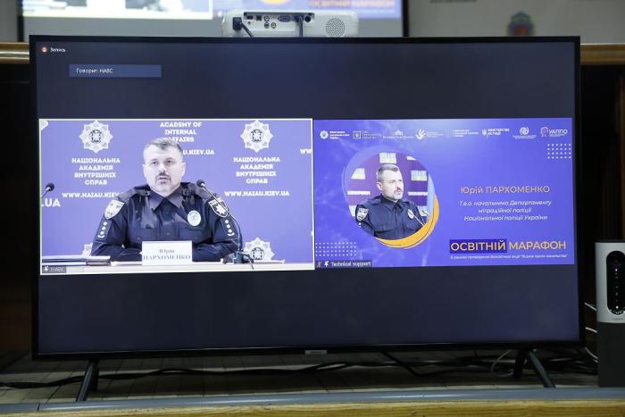 З розгорнутим дискурсом на тему «Ризики торгівлі людьми в умовах збройної агресії рф проти України» виступив начальник Департаменту міграційної поліції Національної поліції України Юрій Пархоменко. Він розповів про створення та діяльність Департаменту міграційної поліції, про боротьбу з торгівлею людьми в умовах збройної агресії рф проти України.