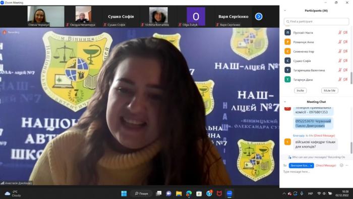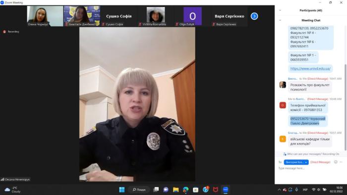 Відділ рекрутингу та організації профорієнтаційної роботи Харківського національного університету внутрішніх справ взяв участь в онлайн-зустрічі з випускниками 11-х класів Вінницького ліцею № 7 імені Олександра Сухомовського, присвяченій «Особливостям вступної кампанії та навчання у Харківському національному університеті внутрішніх справ у 2023 році», яка була організована сектором кадрового забезпечення Вінницького районного управління поліції ГУНП у Вінницькій області.