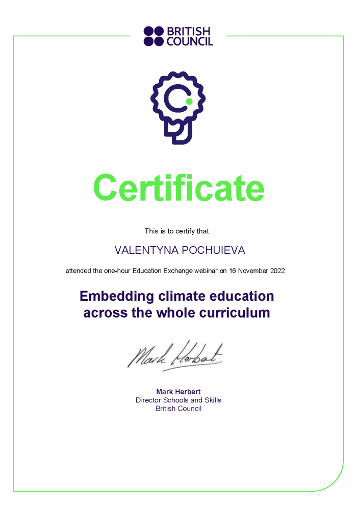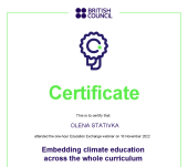 Завідувачка кафедри іноземних мов факультету № 4 ХНУВС Олена Статівка та викладачі цієї ж кафедри Валентина Почуєва, Лариса Сазанова, Олег Гончарук та Артем Білоусов взяли участь у міжнародному онлайн-вебінарі “Embedding climate education across the whole curriculum”, організованому та проведеному спікерами British Council. Під час заходу були розглянуті питання освіти для сталого розвитку, розвитку викладачів у політичному та академічному контекстах, вдосконалення міжнародної освіти та розробки проєктів щодо зміни клімату, розуміння молодими людьми антропоцену та проблем, пов'язаних із продовольчою безпекою.