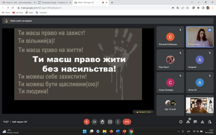 У рамках Всеукраїнської акції «16 днів проти насильства» та проведення “Тижня права” доцентка кафедри соціально-економічних дисциплін Сумської філії ХНУВС Світлана Петровська та студентка 3 курсу денної форми навчання спеціальності «Правоохоронна діяльність» Єлизавета Скрипник провели онлайн-зустріч з учнями 9 та 11 класів Сумської загальноосвітньої школи І-ІІІ ступенів № 8 та прочитали лекцію на тему «Я маю право жити без насильства». Були розглянуті поняття та форми насильства, наведено способи захисту від нього, надано мобільний додаток та основні телефони, за якими у разі потреби можна звертатися за допомогою.