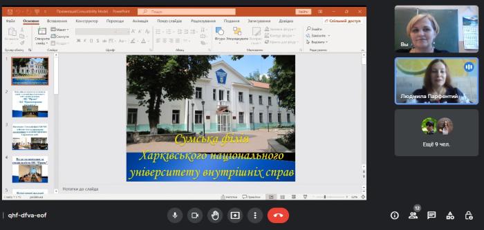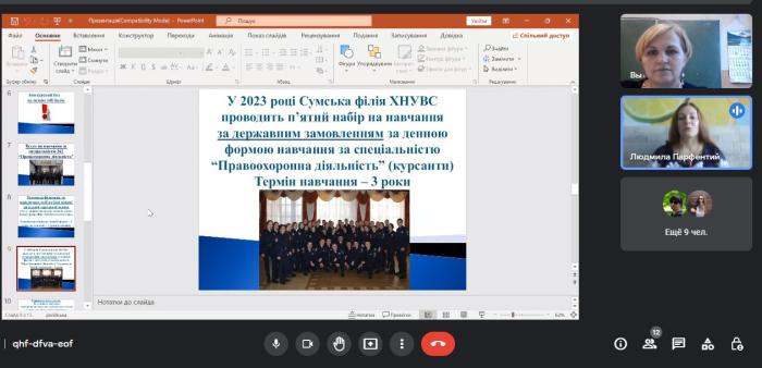 З нагоди Всеукраїнського тижня права, який відзначається з 5 по 11 грудня, доцентка кафедри соціально-економічних дисциплін Сумської філії ХНУВС кандидатка економічних наук Людмила Парфентій дистанційно зустрілася з учнями Сумської ЗОШ І-ІІІ ступенів № 4 імені Героя України Олександра Аніщенка та провела профорієнтаційну бесіду про перспективи юридичної освіти в Україні.