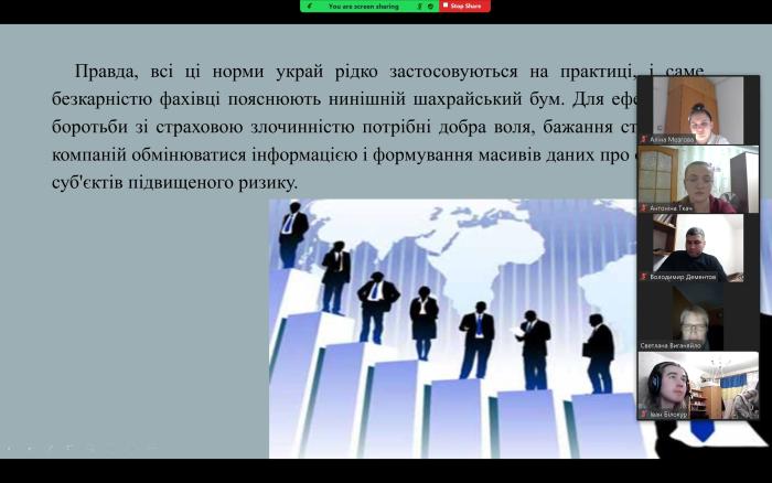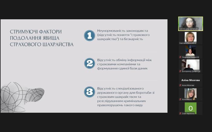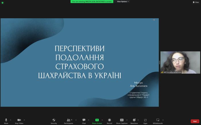 Студентка 3 курсу спеціальності «Право» Аль Хататнех Месун у доповіді «Перспективи подолання страхового шахрайства в Україні» зупинилася на докладному аналізі стримуючих факторів подолання страхового шахрайства в Україні та способах боротьби з даними факторами (науковий керівник: кандидатка економічних наук Світлана Петровська).