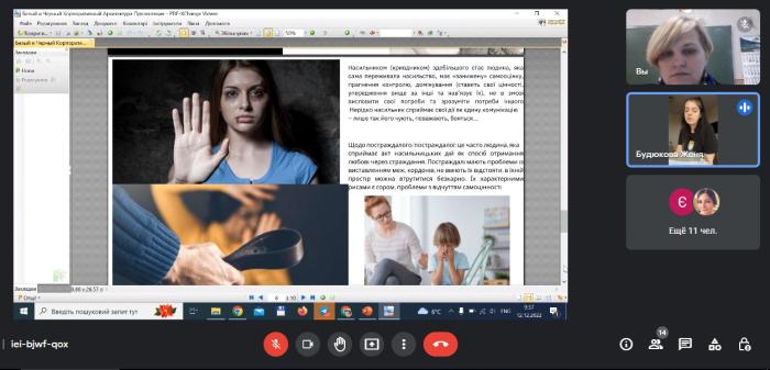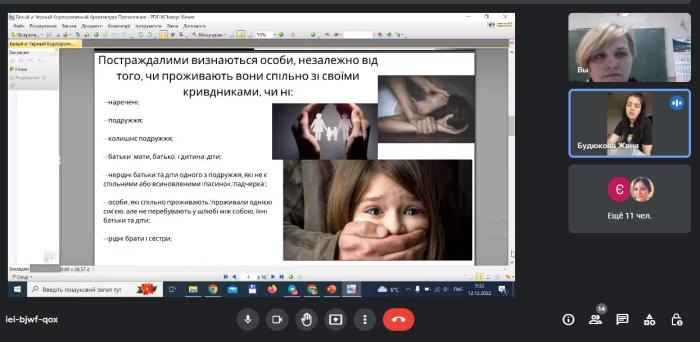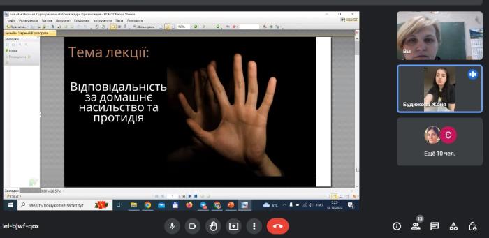 Студентки 4 курсу спеціальності «Право» Сумської філії ХНУВС Євгенія Будюкова та Євгенія Коваленко під керівництвом доцентки кафедри соціально-економічних дисциплін Людмили Парфентій прочитали для учнів 11 класу Сумської загальноосвітньої школи І-ІІІ ступенів № 4 імені Героя України Олександра Аніщенка лекцію на тему «Домашнє насильство: відповідальність і протидія». Було розглянуто типи та основні ознаки насильства в сім’ї, а також зазначено відповідальність, яку несуть особи, що вчинили домашнє насильство та насильство за ознакою статі.