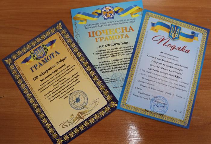 За активну громадську позицію, волонтерську діяльність, благодійну допомогу та плідну співпрацю в підтримці військових, які боронять нашу рідну Україну, волонтери Сумської філії ХНУВС були відзначені грамотами та подяками Благодійного фонду «Дзеркало добра» та Департаменту соціального захисту населення Сумської обласної військової адміністрації з нагоди Міжнародного дня волонтера.