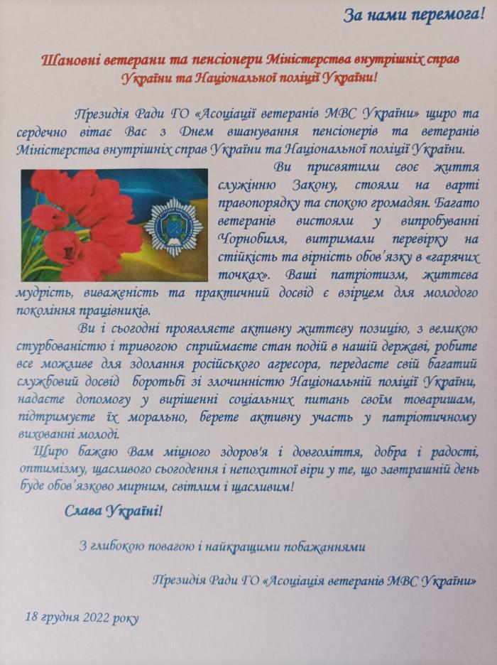 Шановні ветерани та пенсіонери Міністерства внутрішніх справ України та Національної поліції України! Президія ради ГО «Асоціації ветеранів МВС України» щиро та сердечно вітає вас із Днем вшанування пенсіонерів та ветеранів Міністерства внутрішніх справ України та Національної поліції України.