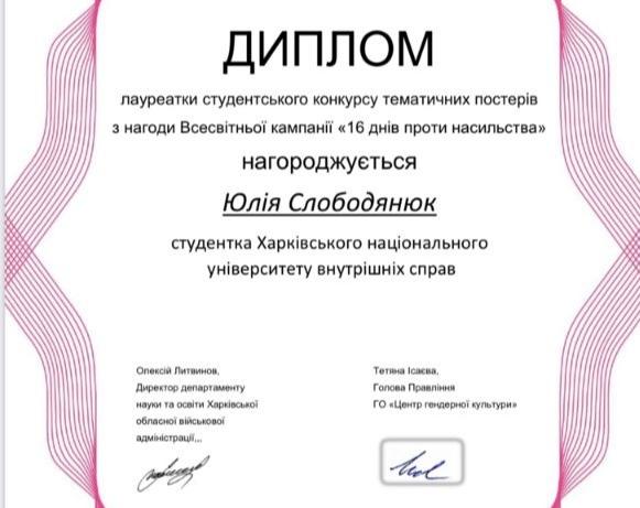 Студентка факультету № 6 ХНУВС Юлія Слободянюк отримала диплом лауреатки студентського конкурсу тематичних постерів із нагоди Всесвітньої кампанії «16 днів проти насильства», який був організований Коаліцією «Харківщина-1325» за підтримки Департаменту науки і освіти Харківської обласної військової адміністрації.