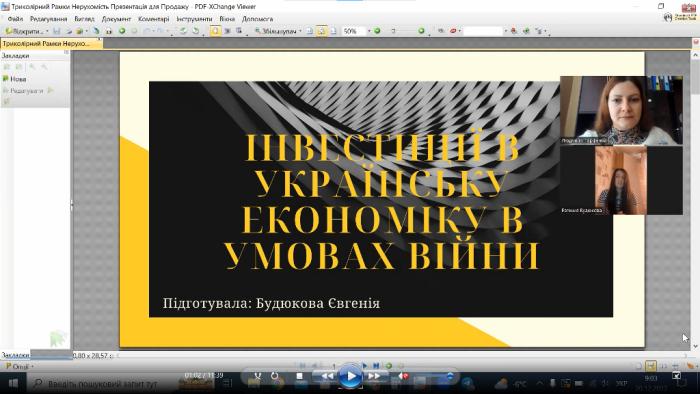Із доповіддю на тему «Інвестиції в українську економіку в умовах війни» виступила студентка 4 курсу спеціальності «Право» Євгенія Будюкова (науковий керівник – кандидатка економічних наук Людмила Парфентій).