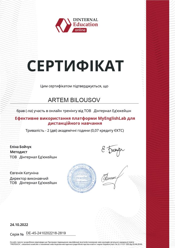 Викладач цієї ж кафедри Артем Білоусов відвідав тренінг «Ефективне використання платформи MyEnglishLab для дистанційного навчання» та ознайомився з основними функціями платформи для роботи з домашнім завданням, можливостями персоналізації, налаштування платформи та технікою моніторингу роботи студентів.
