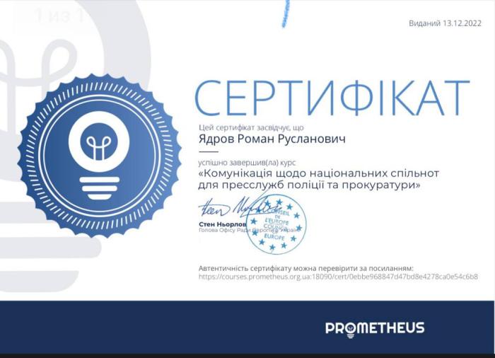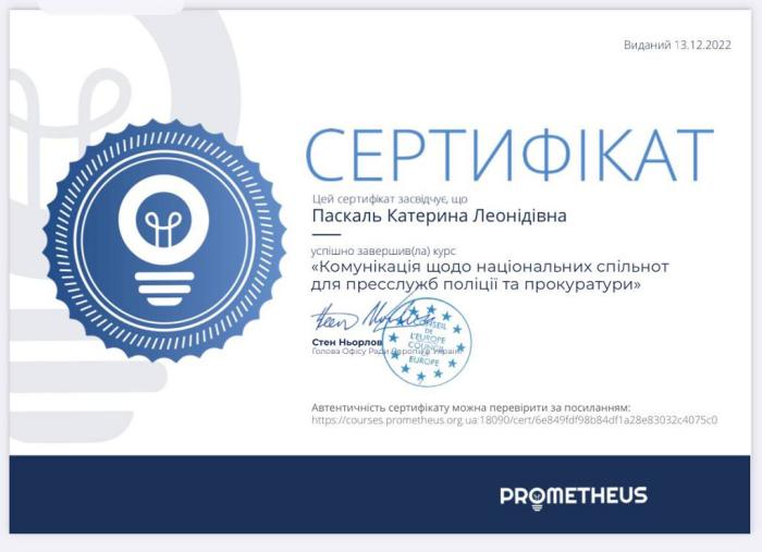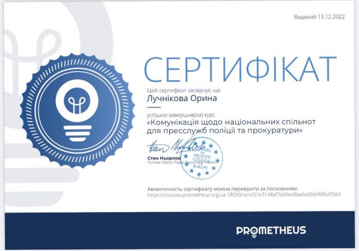 Здобувачі вищої освіти навчальної групи факультету № 2 Харківського національного університету внутрішніх справ під керівництвом куратора групи - доцентки кафедри соціальних та економічних дисциплін кандидатки економічних наук доцентки Марини Петченко пройшли онлайн-курс на тему «Комунікація щодо національних спільнот для пресслужб поліції та прокуратури» на платформі Prometheus.