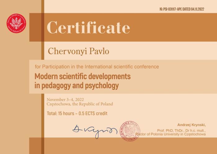 Старший викладач кафедри педагогіки та психології факультету № 3 Олена Макарова та доцент кафедри педагогіки та психології факультету № 3 Павло Червоний взяли онлайн-участь у Міжнародній науковій конференції «Сучасні наукові розробки в галузі педагогіки та психології». Захід відбувся у Полонському університеті, м. Ченстохові Рига, Латвійська Республіка.