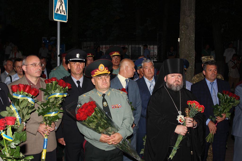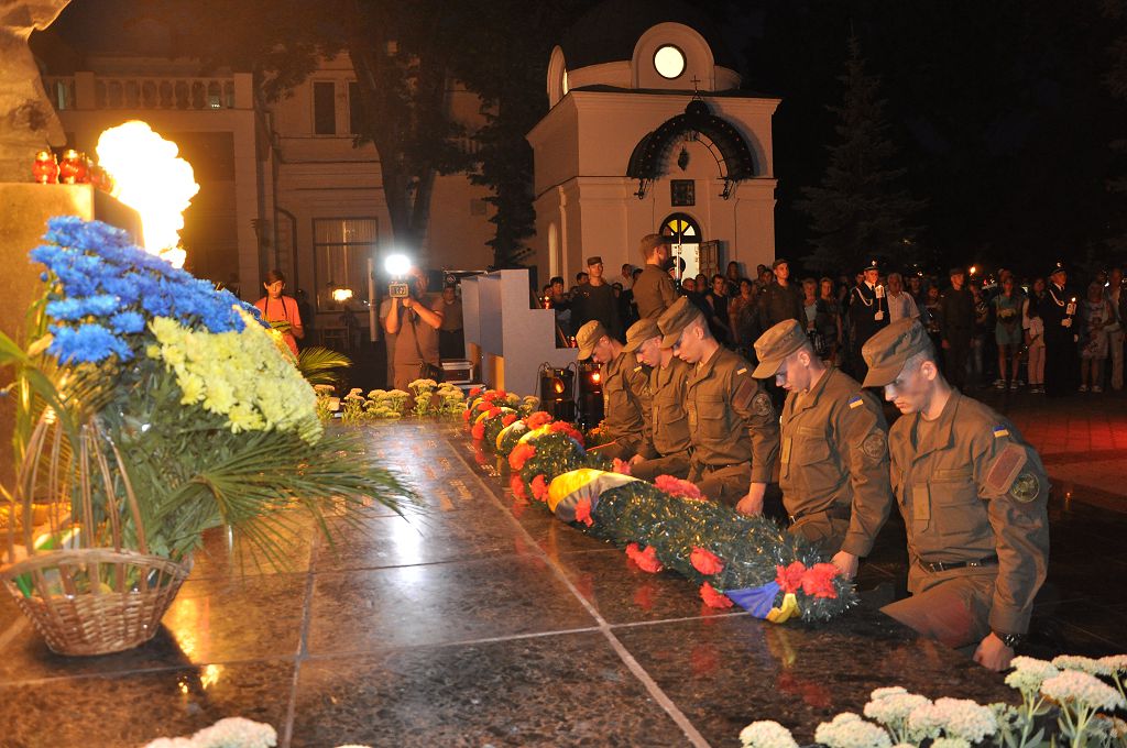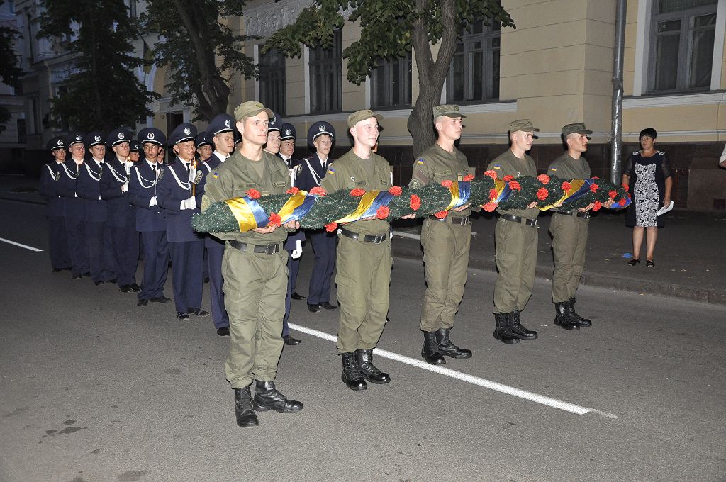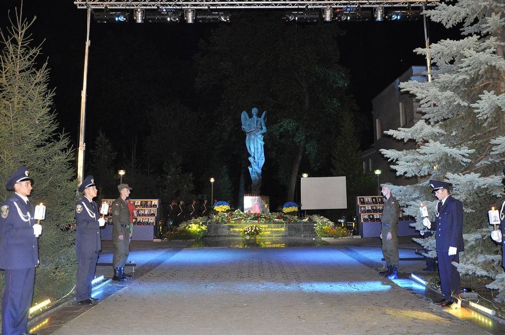 Особовий склад навчального закладу на чолі з ректором Валерієм Сокуренком разом із усіма присутніми поклали гірлянди Пам’яті та квіти до підніжжя скульптурної композиції, запалили свічки у каплиці Архістратига Михаїла під час поминального молебну за упокій душ загиблих.