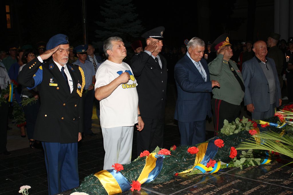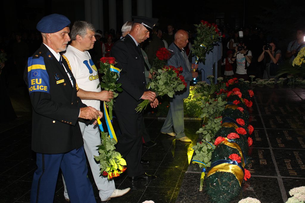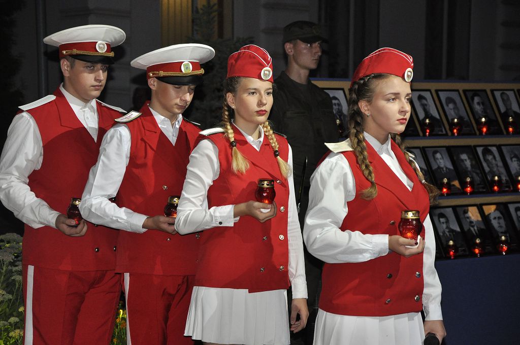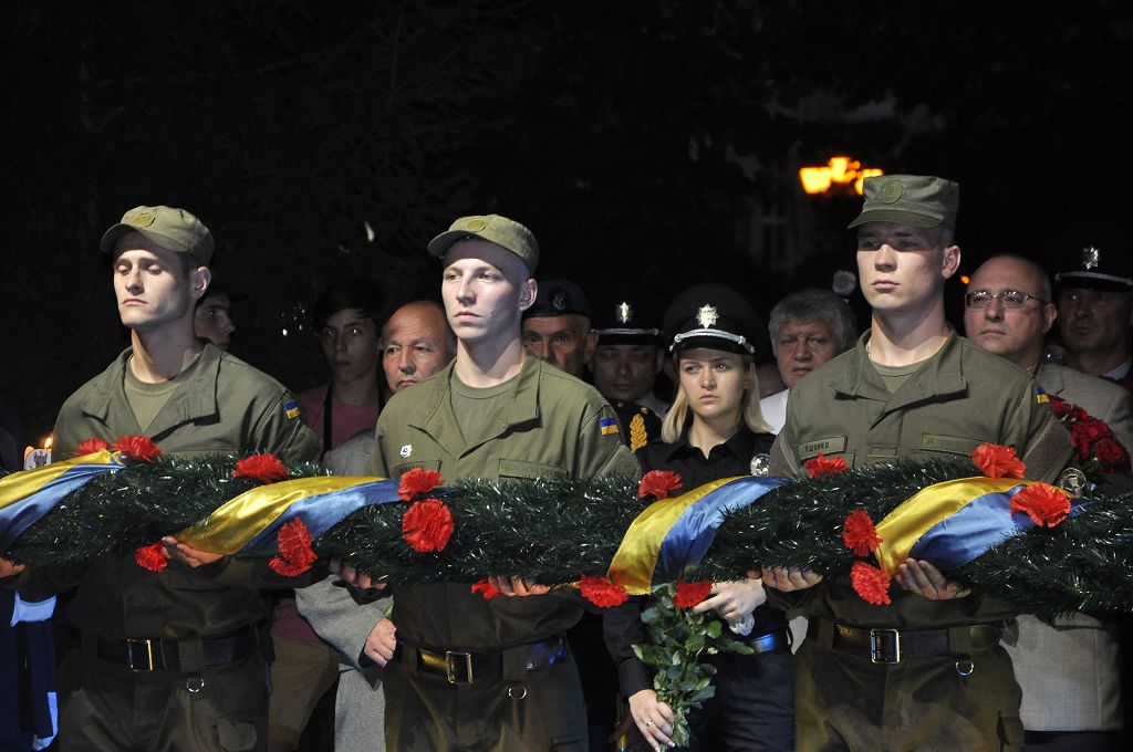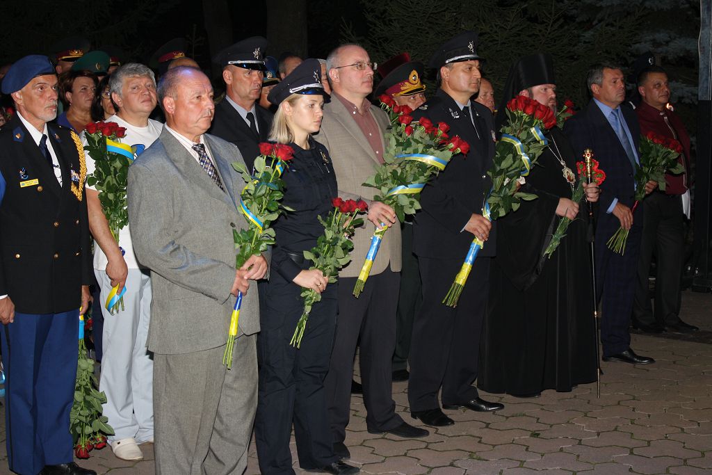 Особовий склад навчального закладу на чолі з ректором Валерієм Сокуренком разом із усіма присутніми поклали гірлянди Пам’яті та квіти до підніжжя скульптурної композиції, запалили свічки у каплиці Архістратига Михаїла під час поминального молебну за упокій душ загиблих.