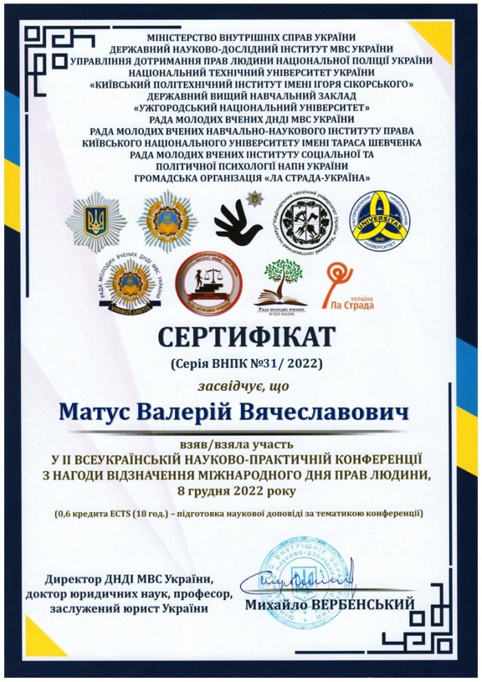 Викладач кафедри юридичних дисциплін Сумської філії ХНУВС Валерый Матус взяв участь у ІІ Всеукраїнській науково-практичній конференції з нагоди відзначення Міжнародного дня прав людини з темою «Права військовополонених в глобальній системі прав людин». Були обговорені питання механізму захисту в Україні прав і свобод людини, реалізації Загальної декларації прав людини у формуванні основ правової системи України, а також визначення демократичних цінностей та прав людини у національному й міжнародному вимірі. За результатами конференції вийшов збірник із тезами учасників конференції.