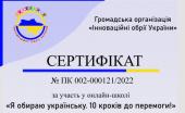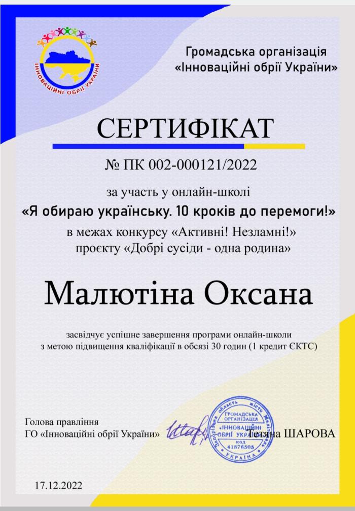 Завідувачка підготовчого відділення, старша викладачка кафедри соціально-гуманітарних дисциплін факультету № 6 ХНУВС кандидатка історичних наук, доцентка Оксана Малютіна пройшла онлайн курс та отримала сертифікат з підвищення кваліфікації «Я обираю українську. 10 кроків до перемоги!», проведений громадською організацією «Інноваційний обрій України».