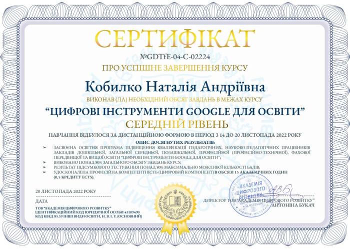 Доцентка кафедри соціально-гуманітарних дисциплін факультету № 6 ХНУВС кандидатка філологічних наук Наталія Кобилко пройшла онлайн-курс «Цифрові інструменти Google для освіти» від Міністерства освіти і науки України та Google Україна. Навчання відбувалося у віртуальному просторі Google Classroom. Учасники мали прослухати відеолекції, виконати практичні завдання та скласти підсумковий тест. Заняття проводила сертифікована тренерка Google, директорка ТОВ «Академія цифрового розвитку» Антоніна Букач. Курс складався з трьох рівнів: базовий – забезпечення навчального процесу за допомогою мобільного пристрою; середній – для учасників, які прагнуть опанувати вебпереглядач Google Chome; поглиблений – робота з ноутбуками Chromebook.
