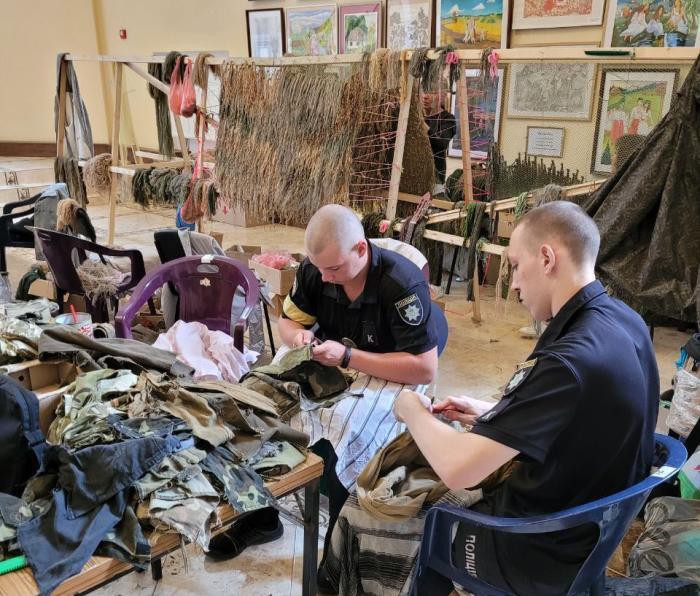 Врятувати життя на фронті здатна не лише зброя, але й маскування – сітки, маскувальні костюми, які роблять наших хлопців і військову техніку максимально непомітними. Такі засоби дозволяють «бути» одночасно і зеленню, і листям, і навіть снігом взимку. З перших днів війни курсанти та студенти Харківського національного університету внутрішніх справ беруть активну участь у виготовленні маскувальної «зброї» – приєднуються до відкритих груп, благодійних фондів, громадських об’єднань. Це копітка робота, що потребує уважності й терпіння. Кожний виконує своє завдання – одні нарізають клаптики, інші вплітають їх в основу. Зважаючи на те, що засоби маскування легко псуються й горять під час обстрілів, потреба в них однаково лишається нагальною, тож їх виготовлення триває протягом усієї війни.