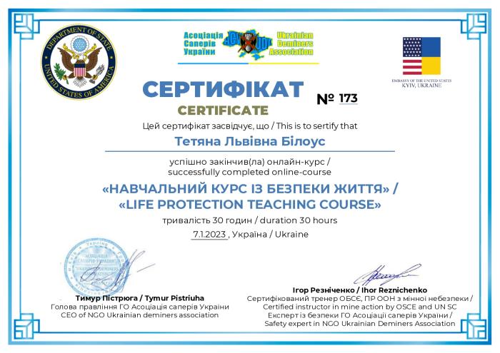 Під час навчання були розглянуті наступні теми: «Заклади освіти під час війни», «Евакуація закладів освіти», «Дії під час раптових обстрілів», «Протимінна безпека та мінно-вибухові травми». По закінченню навчального курсу та підсумкового тестування Тетяна Білоус отримала сертифікат.