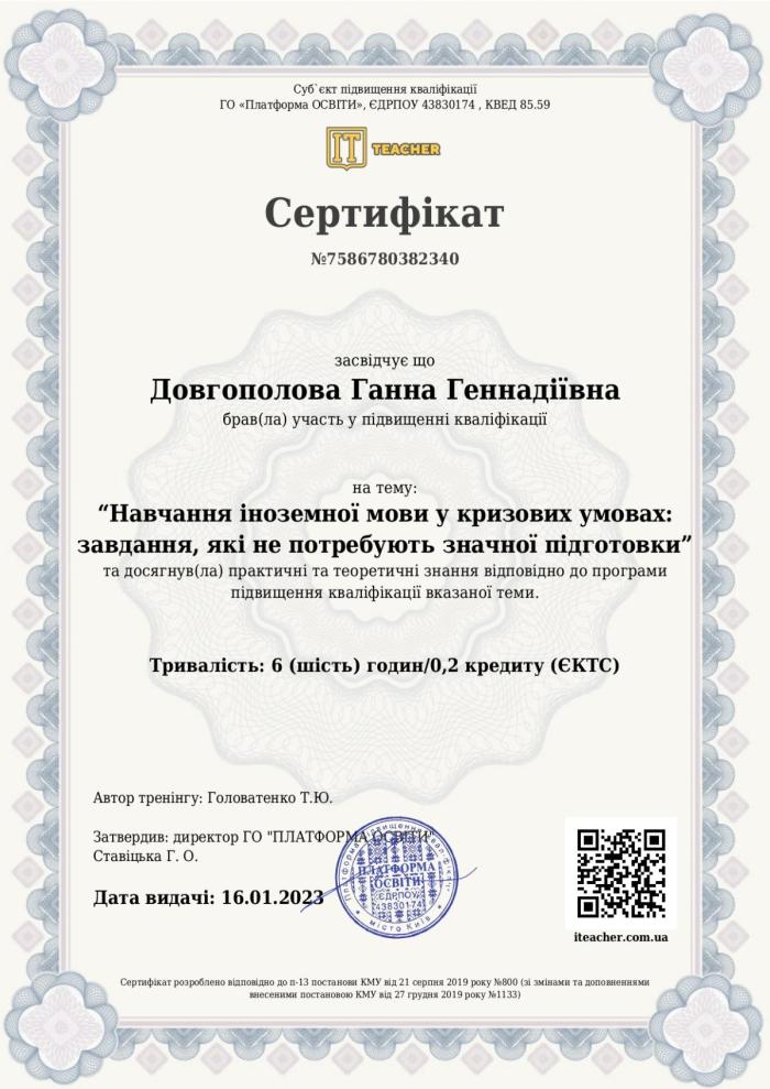 За результатами проходження вебінару Ганна Довгополова отримала сертифікат про підвищення кваліфікації (2 години (0,06 кредиту ЄКТС)). Набуті компетентності будуть використані в освітньому процесі.