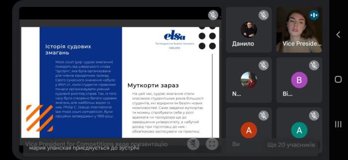 Учасники ELSA Sumy взяли участь у презентації ELSA змагань, що відбулася в онлайн форматі. Темою просвітницької зустрічі студентів-правників, яку провела віцепрезидентка зі змагань ELSA Ukraine Юлія Костів, стали мут-корти.