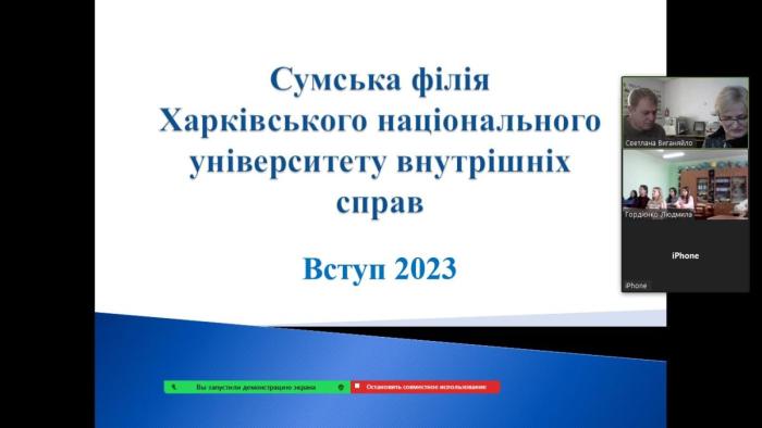 Профорієнтаційну онлайн-зустріч із учнями одинадцятого класу опорного закладу Недригайлівської спеціалізованої загальноосвітньої школи І-ІІІ ступенів провели доцентка кафедри соціально-економічних дисциплін Сумської філії ХНУВС Світлана Виганяйло та провідний спеціаліст Валерій Кудрявцев. Школярі із зацікавленістю прослухали інформацію про Сумську філію Харківського національного університету внутрішніх справ, про напрями, за якими ведеться освітня діяльність у закладі вищої освіти, особливості вступної кампанії 2023 року та отримали вичерпні відповіді на свої запитання щодо правил вступу, умов навчання та подальшого працевлаштування.