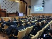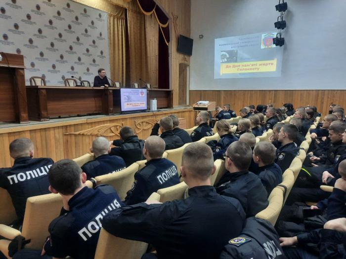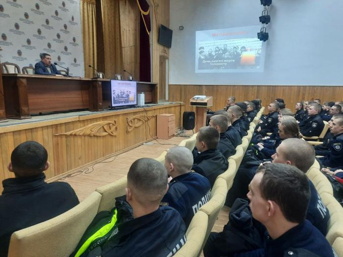 Фахівець відділення дозвілля Андрій Прохоров ознайомив курсантів з останньою резолюцію Генеральної Асамблеї ООН про неприпустимість невизнання Голокосту та з гучними судовими процесами у Німеччині над колишніми посібниками й виконавцями цього злочину, які красномовно доводять, що у військових злочинів ані минулих, ані теперішніх часів немає строку давності.