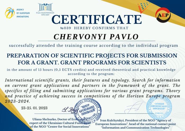 Доцент кафедри педагогіки та психології факультету № 3 Харківського національного університету внутрішніх справ кандидат педагогічних наук, доцент Павло Червоний пройшов тренінг-курс за індивідуальною програмою «Підготовка наукових проєктів до подання на грант. Грантові програми для науковців» та отримав відповідний сертифікат.