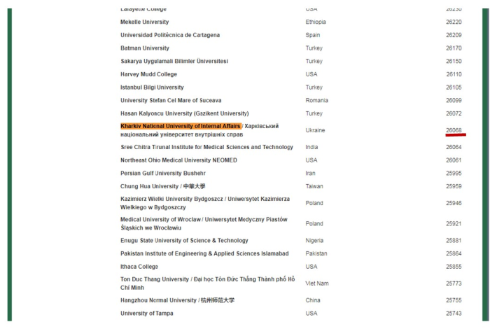 Харківський національний університет внутрішніх справ увійшов до рейтингу з показником цитованості 26068, збільшивши його у порівнянні з показником минулорічного випуску майже на 1,5 тис. цитувань, і це найкращий результат серед ЗВО МВС.
