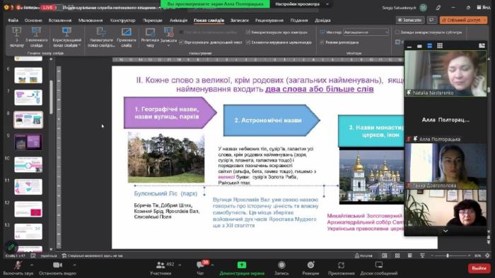 Тренінгову онлайн-сесію присвятили обговоренню сучасних змін в орфографії та лексиці, а також проаналізували питання правопису власних назв (кожне слово з великої, перше та єдине слово з великої), складних прикметників, вживання тавтології, плеоназму, багатослів'я. Учасники засвоїли нові лексико-орфографічні норми вживання сучасної української мови.