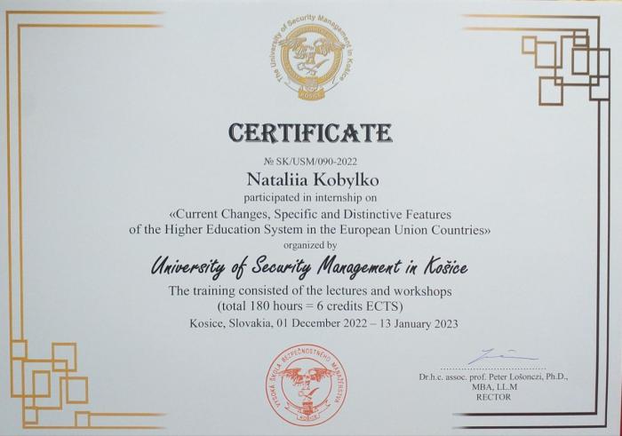 Доцентка кафедри соціально-гуманітарних дисциплін факультету №6 ХНУВС кандидатка філологічних наук Наталія Кобилко пройшла міжнародне стажування у Вищій школі менеджменту безпеки в Кошицях (Vysoká škola bezpečnostného manažérstva v Košiciach). Навчальний заклад спеціалізується на підготовці фахівців із фінансової, екологічної, транспортної, авіаційної та кібербезпеки. Це приватний університет Словаччини, заснований у 2006 році.