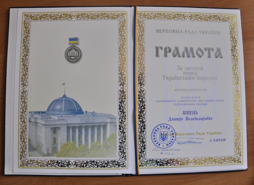 Колектив Харківського національного університету внутрішніх справ вітає т.в.о. першого проректора університету, підполковника поліції Дмитра Володимировича Швеця з високою нагородою - Грамотою Верховної Ради України - за заслуги перед Українським народом.