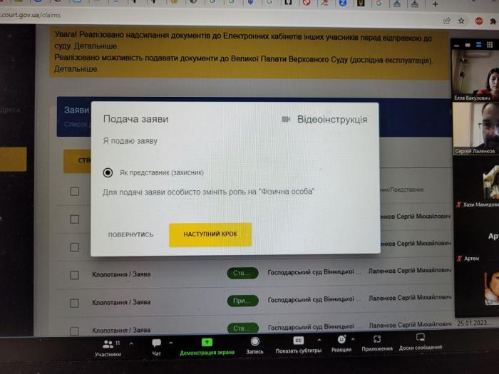 Для студентів 4 курсу факультету №6 ХНУВС доцентка кафедри цивільного права та процесу Елла Вакулович провела бінарне заняття з дисципліни «Господарський процес» за участю адвоката Сергія Лаленкова. Під час заняття висвітлювались питання роботи судів у період воєнного стану в Україні та способи звернення до суду за захистом прав за допомогою електронного суду. На сьогоднішній день електронний суд є самостійною унікальною формою судового процесу, заснованого на новітніх інформаційних технологіях, що забезпечують повний цикл розгляду судової справи в електронному форматі. На прикладах судових справ адвокат пояснив студентам порядок користування можливостями електронного суду та звернув увагу на участь представника в господарському процесі. Також обговорювались особливості проведення судових засідань у формі відеоконференцій. Студенти отримали відповіді на актуальні запитання щодо порядку звернення до суду онлайн. Отримані практичні поради стануть у нагоді майбутнім фахівцям у подальшій професійній діяльності.