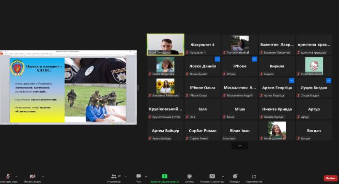 Чергова профорієнтаційна онлайн-зустріч із випускниками шкіл м. Кам`янець-Подільський відбулася на факультеті №4 Харківського національного університету внутрішніх справ. Під час заходу майбутнім абітурієнтам розповіли про перспективи навчання у Харківському поліцейському виші, надали інформацію про факультети та спеціальності, за якими здійснюється підготовка фахівців, про умови навчання та проживання курсантів, спортивні секції, наукові гуртки тощо. У презентаційному форматі було докладно наведено покроковий алгоритм дій абітурієнта при вступі до закладу вищої освіти. Учасники заходу отримали вичерпні відповіді на свої запитання.