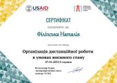 Старша викладачка кафедри конституційного і міжнародного права факультету № 4 Наталія Філіпська взяла участь у вебінарі «Організація дистанційної роботи в умовах воєнного стану» й за результатами роботи отримала сертифікат. Захід був організований Українською гельсінкською спілкою з прав людини та USAID. З питань законодавчого врегулювання дистанційної роботи виступив доктор юридичних наук, експерт УГСПЛ Володимир Буряк.