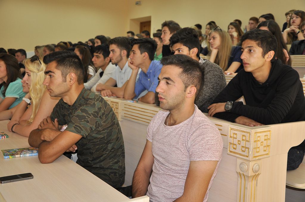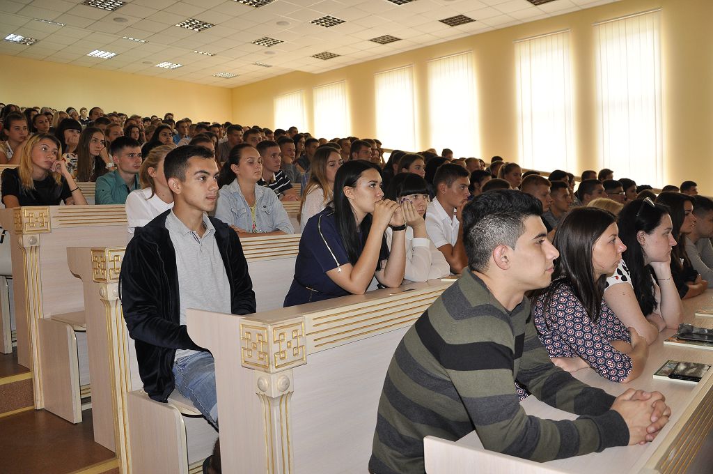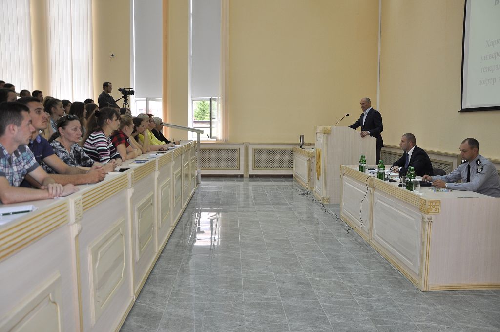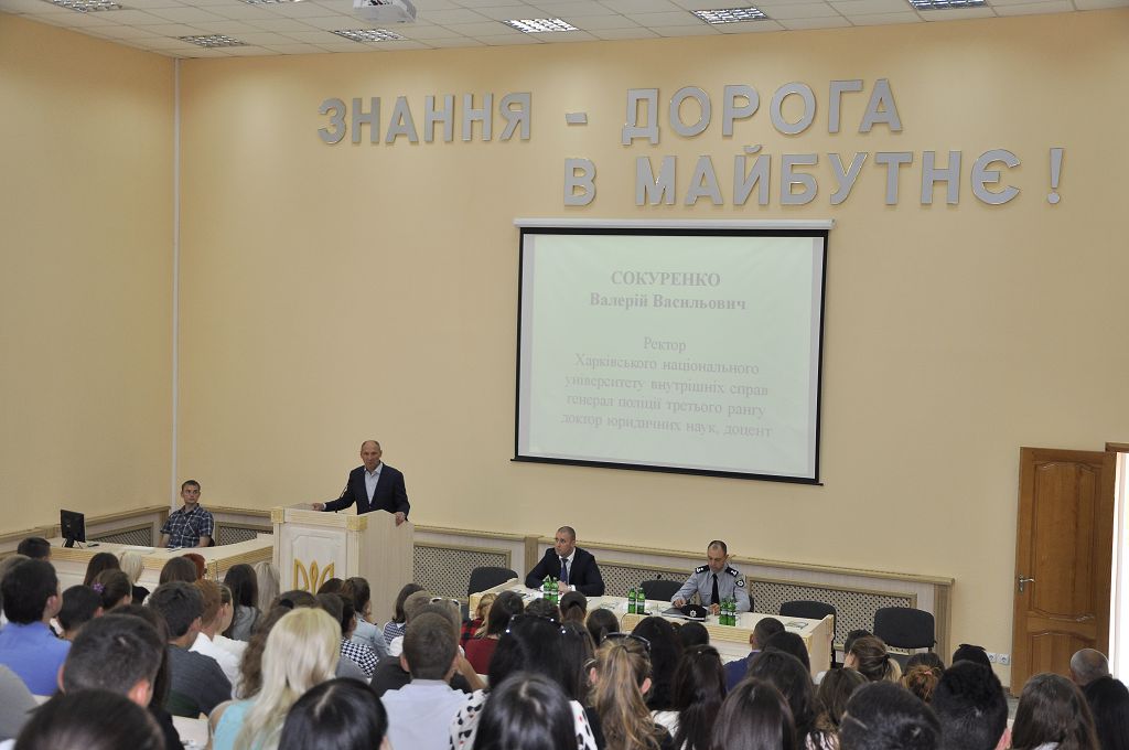 На початку нового навчального року ректор Харківського національного університету внутрішніх справ Валерій Сокуренко зустрівся зі студентами-першокурсниками. У зустрічі також взяли участь т.в.о. першого проректора навчального закладу Дмитро Швець, проректор Анатолій Клочко, декан факультету № 6 (права та масових комунікацій), на якому навчаються студенти, Олег Синєгубов та ін.
