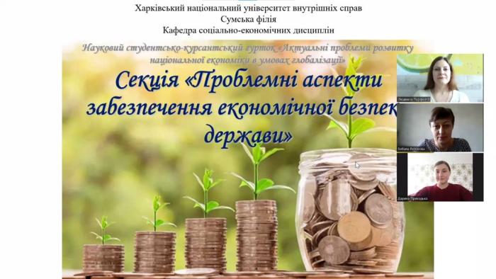 Для подолання негативних наслідків збройної агресії Росії проти України, забезпечення фінансової стабілізації та економічного відновлення надзвичайно важливою є міжнародна фінансова підтримка. Саме цим питанням було присвячено засідання секції «Проблемні аспекти забезпечення економічної безпеки держави» наукового студентсько-курсантського гуртка кафедри соціально-економічних дисциплін Сумської філії ХНУВС «Актуальні проблеми розвитку національної економіки в умовах глобалізації».