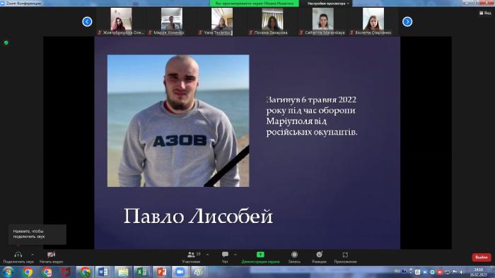 На початку засідання, всі учасники вшанували пам’ять загиблих під час збройної агресії хвилиною мовчання. Члени наукового гуртка виступили із доповідями на теми: «Ключові питання та відповіді про російську агресію» щодо хронології збройної агресії Російської Федерації проти України; «Герої не вмирають», де згадуються випускники КЛК ХНУВС, що загинули, та герої, іменами яких названо вулиці; «Волонтери – люди доброї волі».