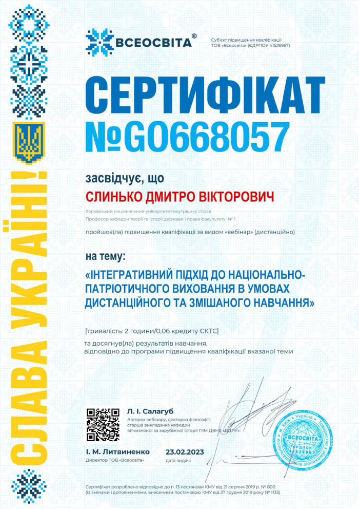 Професор кафедри теорії та історії держави і права факультету № 1 Дмитро Слинько взяв участь у вебінарі «Інтегративний підхід до національно-патріотичного виховання в умовах дистанційного та змішаного навчання», який відбувся на Національній освітній платформі «Всеосвіта». За результатами участі у вебінарі Дмитро Слинько пройшов тестування та отримав відповідний сертифікат. Набуті компетентності будуть використані в освітньому процесі.