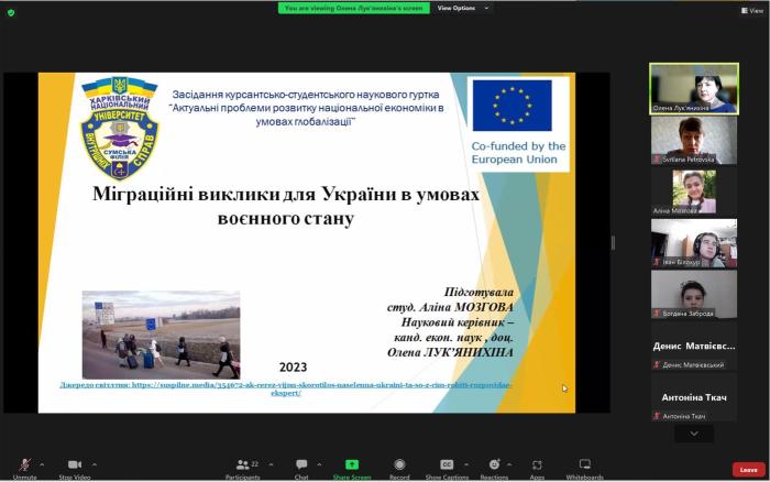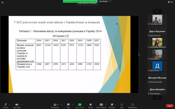 Відбулося розширене планове онлайн засідання наукового гуртка кафедри соціально-економічних дисциплін Сумської філії ХНУВС «Актуальні проблеми розвитку національної економіки в умовах глобалізації» на тему «Міграційні виклики для України в умовах воєнного стану», доповідач студентка 1-го курсу Аліна Мозгова (науковий керівник кандидатка економічних наук, доцентка Олена Лук’янихіна).
