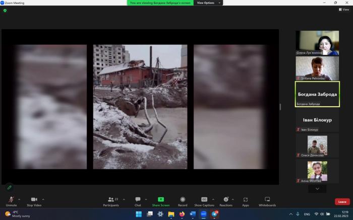 Першокурсниця Богдана Заброда розповіла про події на початку війни в м. Охтирка та Тростянець і про героїчний супротив військових, містян, які забезпечили неможливість просування загарбників до Сум, Полтави та Києва. Про наслідки руйнувань після авіаударів, масованих обстрілів, біль та емоції після пережитого побачили під час перегляду відео.
