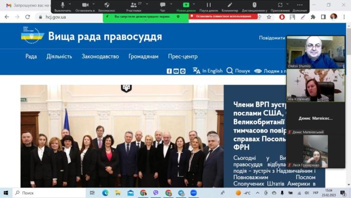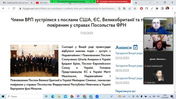 Відбулося засідання наукового гуртка «Державно-правових дисциплін» Сумської філії ХНУВС у межах викладання дисциплін «Конституційне право» та «Судові та правоохоронні органи України» із студентами 1 та 2 курсів спеціальностей «Право» та «Правоохоронна діяльність». Онлайн-засідання провели кандидат юридичних наук, професор Олексій Шуміло та кандидатка історичних наук, доцентка Леся Гончаренко. У заході взяла участь членкиня Вищої ради правосуддя Алла Котелевець. До свого нещодавнього обрання членом Вищої ради правосуддя, що відбулося 11 січня 2023 року на ХІХ позачерговому з’їзді суддів України, Алла Вікторівна працювала суддею Харківського апеляційного суду та має вагомий практичний досвід у судовій системі України. Алла Вікторівна розповіла студентам про повноваження Вищої ради правосуддя, особливості її діяльності, ознайомила майбутніх юристів і правоохоронців із сучасним станом справ у судовій системі України, необхідними напрямами реформування. Поділилася й з особливостями та процедурою відбору до Вищої ради правосуддя. На жаль, студенти не встигли поставити запитання Аллі Вікторівні, бо пролунала повітряна тривога, але від цього зустріч вийшла не менш змістовною та корисною для здобувачів вищої освіти. На завершення засідання керівництво гуртка вирішило повторно запросити членкиню Вищої ради правосуддя Аллу Котелевець на ще одне із засідань гуртка. Гуртківці щиро вдячні висококваліфікованому спеціалісту за проведену зустріч.