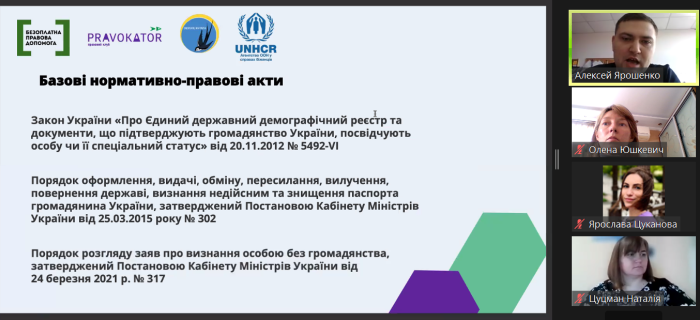 Науково-педагогічні працівники та курсанти факультету №1, задіяні у роботі відділення юридичної клініки Харківського національного університету внутрішніх справ у м. Кам’янець-Подільський, взяли участь в онлайн-зустрічі «Встановлення особи під час процедури визнання особою без громадянства» з адвокатом, заступником менеджера проєкту з надання правової допомоги особам без громадянства ГО «Десяте квітня» Олексієм Ярошенком. Захід проведено в межах роботи правового клубу «PRAVOKATOR» – комунікаційної платформи серед державних установ, що створена в системі безоплатної правничої допомоги (БПД).