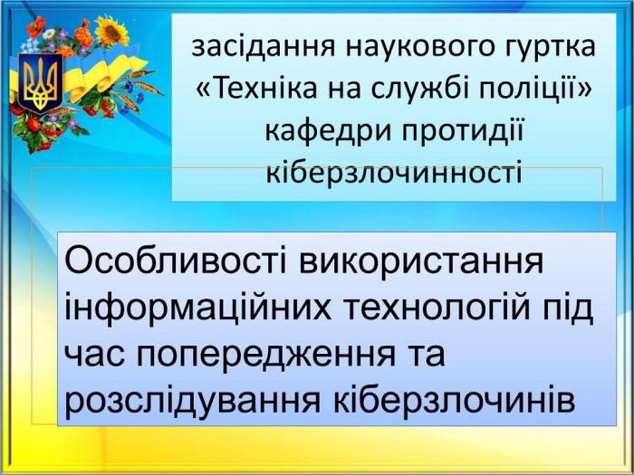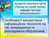 Відбулося засідання наукового гуртка кафедри протидії кіберзлочинності факультету № 4 під головуванням завідувача кафедрою Олександра Манжая. Він розповів про особливості використання інформаційних технологій під час попередження та розслідування кіберзлочинів. Наголосив, що за останній час збільшилася кількість злочинів, пов’язаних з використанням мережі Інтернет, використанням віртуальних крамниць і фірм, що надають платні послуги з вилученням з рахунків і кредитних карток громадян «електронних» грошових коштів тощо. Вирішення зазначених проблем можливе за наявності постійно діючих, відкритих для усіх зацікавлених сторін програм моніторингу, аналізу, упорядкування й випробування інструментарію експертного дослідження при розслідуванні кіберзлочинів.