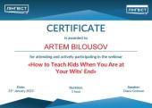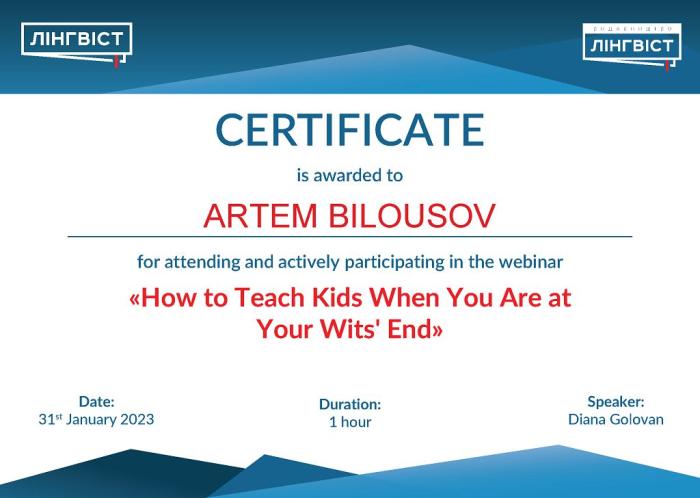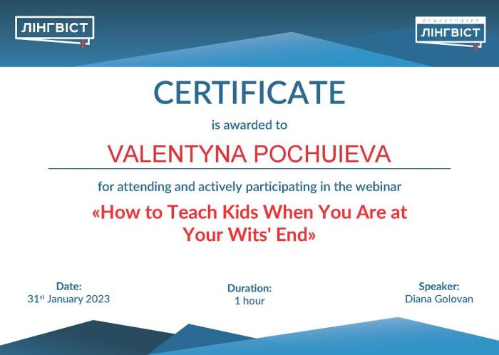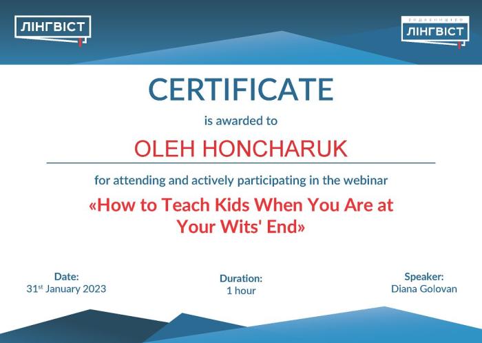 Завідувачка кафедри іноземних мов факультету № 4 Олена Статівка та викладачі цієї ж кафедри Валентина Почуєва, Лариса Сазанова, Олег Гончарук та Артем Білоусов взяли участь у міжнародному онлайн-вебінарі “How to Teach Kids When You Are at Your Wits' End”, організованому видавництвом «Лінгвіст». Вебінар проведено сертифікованим викладачем із досвідом викладання англійської мови та адаптації міжнародних підручників для потреб українських викладачів і студентів.