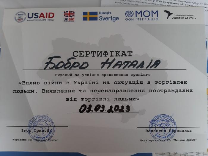 За результатами успішного проходження тренінгу Наталія Бобро отримала сертифікат.