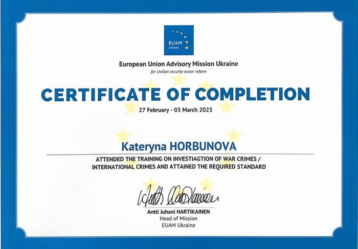 Викладач кафедри кримінального процесу та організації досудового слідства факультету № 1 Харківського національного університету внутрішніх справ Катерина Горбунова пройшла тренінг з розслідувань воєнних та міжнародних злочинів, організований Консультативною місією Європейського Союзу, та отримала відповідний сертифікат. Під час тренінгу розглядалися питання щодо особливостей розслідування справ про міжнародні злочини, збір доказів у справах про міжнародні злочини, масові захоронення та ексгумація, кримінальний аналіз, дослідження відкритих джерел інформації, допит свідка та потерпілого, огляд місця події, види відповідальності, міжнародні злочини та злочини сексуального насильства, пов’язаного з конфліктом, захист свідків та інше. Тренінг проводився європейськими тренерами, які мають практичний досвід у розслідуванні воєнних та міжнародних злочинів. Знання та досвід, отримані під час тренінгу, будуть впроваджуватися у навчальний процес курсантів ХНУВС, що вкрай необхідно в умовах воєнного стану і Україні.