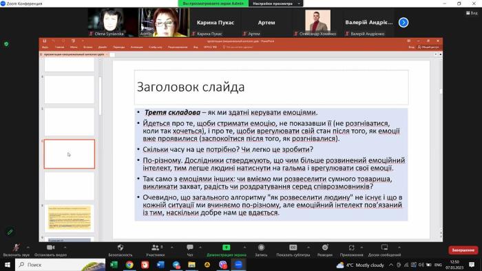 Тетяна Мироненко ознайомила студентів з темою «Емоційний інтелект». Особливу увагу було присвячено з’ясуванню відмінностей між емоційним інтелектом (ЕІ) та коефіцієнтом інтелекту (IQ), зв’язком між розвиненістю емоційного інтелекту та задоволеністю роботою, складовим емоційного інтелекту та вмінням використовувати свій емоційний інтелект в роботі, в тому числі й у публічній службі, врахуванню емоційного інтелекту на робочому місці. Усі теоретичні матеріали були розтлумачені на конкретних прикладах та службових ситуаціях. Тетяна Мироненко поділилася власним досвідом проходження відбору на посаду заступника ОДА Сумської області та використанням свого емоційного інтелекту на керівних посадах, які вона обіймала.