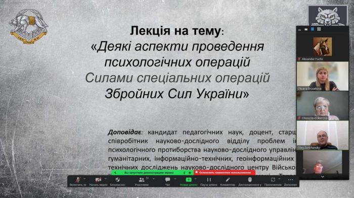 За ініціативи декана факультету №6 ХНУВС Оксани Брусакової для студентів факультету була проведена лекція за темою «Деякі аспекти проведення психологічних операцій Силами спеціальних операцій Збройних Сил України». Прочитав лекцію старший науковий співробітник відділу проблем інформаційно-психологічного протиборства науково-дослідного центру Військового інституту Київського національного університету імені Тараса Шевченка, кандидат педагогічних наук, доцент Олег Зарічанський. Особливу увагу науковий співробітник приділив визначенню ССО, а також завданням, цілям і заходам, які безпосередньо виконувались у зоні їх відповідальності. Студенти з зацікавленістю прослухали лекцію та отримали вичерпні відповіді на свої запитання.