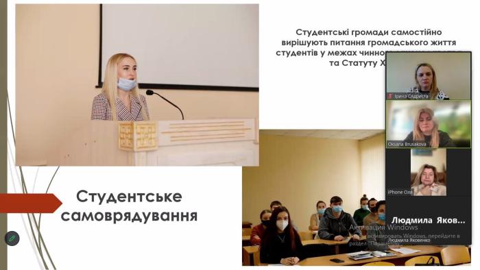 Учасникам зустрічі розповіли про умови вступу до ХНУВС, зокрема особливості навчання на факультеті №6, спеціальності, за якими навчаються студенти, переваги працевлаштування після закінчення університету. Було продемонстровано відеоролик потужної матеріально-технічної бази вишу. Представники кафедри правового забезпечення підприємницької діяльності та фінансової безпеки розповіли про актуальність та перспективи здобуття вищої освіти за спеціальностями «Право», «Правоохоронна діяльність», «Кiбербезпека», «Фінанси, банківська справа та страхування» в умовах сьогодення. Друкована продукція про Харківський поліцейський виш також була розміщена на інформаційному сайті школи з метою ознайомлення майбутніх випускників та їхніх батьків з умовами вступу.
